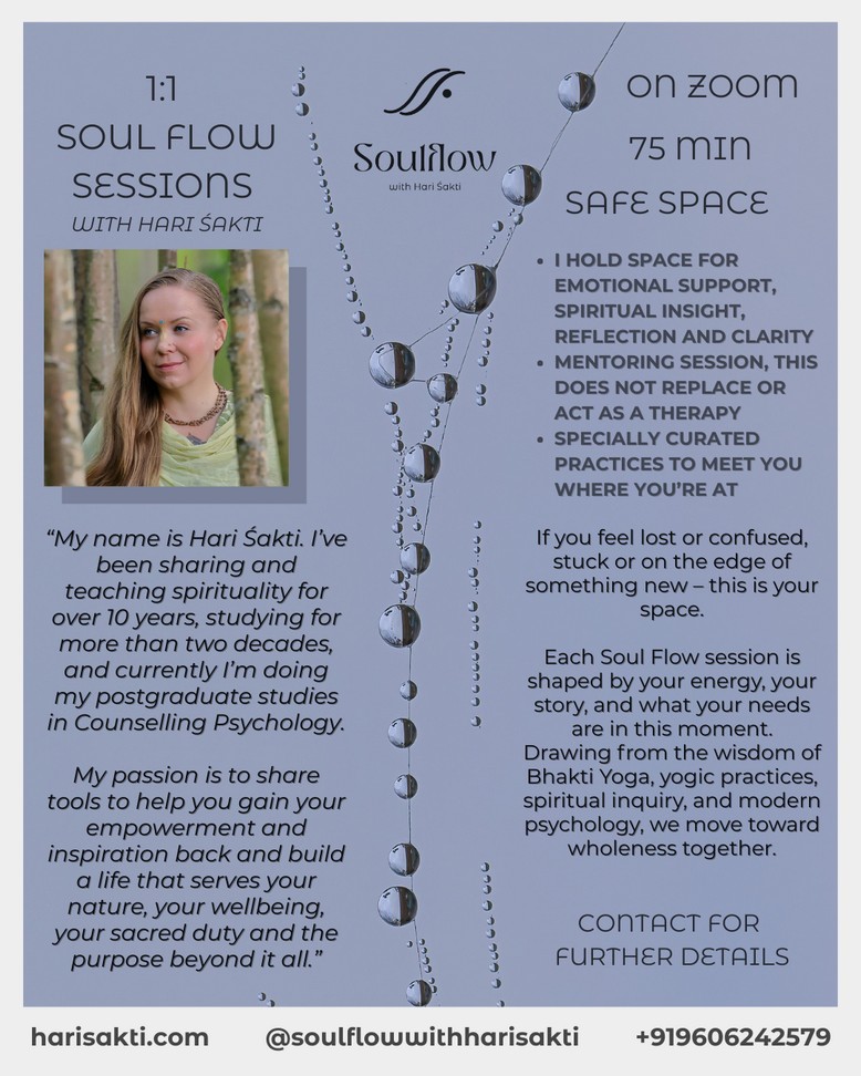 Each Soul Flow session is a co-creation, shaped by your energy, your story, and what your needs are in this moment. Drawing from the wisdom of Bhakti Yoga, yogic practices, spiritual inquiry, and modern psychology, we move toward wholeness using different tools and practices.